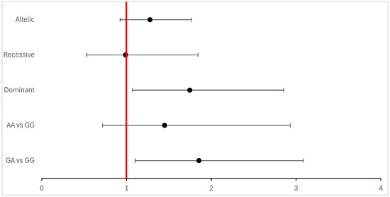 In the dominant model (GA + AA vs. GG), a significant association was detected (OR = 1.747, 95% CI: 1.069–2.856, p = 0.026). The recessive model (AA vs. GG + GA) did not show significance (OR = 0.989, 95% CI: 0.530–1.844, p = 0.972).