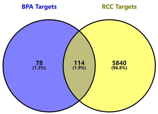 We identified 192 BPA-related toxicity targets from the SwissTargetPrediction, ChEMBL, and STITCH databases, and 5954 targets strongly associated with ccRCC through analysis of the GeneCards, OMIM, and TTD databases. Integrating these target sets and removing duplicates resulted in 114 overlapping targets as potential candidates mediating BPA-induced ccRCC (Figure 1). It presents a Venn diagram illustrating the intersection between BPA-related targets and ccRCC disease targets. Specifically, 192 BPA-related targets intersect with 5954 ccRCC-related targets, identifying 114 potential toxicity targets that may mediate BPA-induced ccRCC. A detailed list of these targets is provided in Supplementary Table S1B.