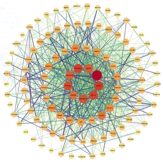 A PPI network was constructed using the STRING database, consisting of 114 nodes and 1030 edges. The network exhibited an average node degree of 18.1, an average local clustering coefficient of 0.565, and a PPI enrichment p-value of <1.0 × 10−16, indicating statistically significant interactions among the identified targets. Topological properties of the network nodes, including degree and betweenness centrality, were analyzed using Cytoscape software, resulting in an optimized visualization of the PPI network (Figure 2). Figure 2 shows the PPI network of 114 potential targets, visually representing interactions between these targets. Node size and color correspond to degree values, while edge thickness and color reflect interaction strength.