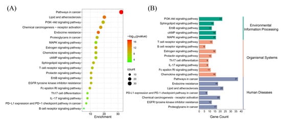 KEGG enrichment analysis of potential targets. (A) The bubble plot shows the top 20 enriched KEGG pathways, with bubble size representing the number of enriched genes and color intensity indicating pathway significance. (B) The histogram illustrates the enrichment frequency of each pathway, where bar length corresponds to the gene count, and color reflects the enrichment significance.