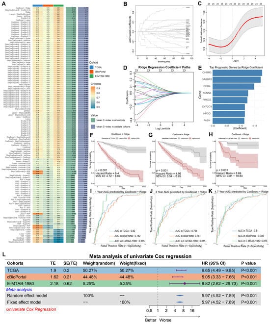 Construction and validation of the prognostic signature for BPA-associated clear cell renal cell carcinoma (ccRCC). (A) Comparative evaluation of 10 machine learning algorithms—including Random Survival Forests (RSF), Elastic Net (Enet), Lasso, Ridge, CoxBoost, plsRcox, Supervised Principal Components (SuperPC), Generalized Boosted Regression Models (GBM), and Survival Support Vector Machines (Survival-SVM)—based on concordance index (C-index) performance. (B) Identification of 23 key BPA-ccRCC-associated genes from 114 candidate targets using the CoxBoost algorithm. (C,D) Ridge regression optimization for prognostic gene selection in BPA-ccRCC model (Integrated with CoxBoost algorithm). (C) Regularization parameter tuning: Partial likelihood deviance curve (solid red line) versus Log(λ). The dashed vertical line marks optimal regularization strength where deviance stabilizes within a minimal confidence band (gray ribbon), balancing model complexity and generalizability. (D) Coefficient shrinkage paths: Trajectories of 23 CoxBoost-selected gene coefficients across Log(λ) values. Each colored line represents the coefficient shrinkage path of a single gene, with distinct colors used for visual discrimination among the 23 different genes. (E) Ranking of signature genes by absolute regression coefficient magnitude (CHRM3, GABBR1, CCR4, KCNN4, PRKCE, CYP2C9, HPGD, FASN shown). (F–H) Kaplan–Meier survival analysis stratified by risk score ((F) TCGA cohort, (G) cBioPortal validation cohort, (H) E-MTAB-1980 validation cohort). (I) Time-dependent ROC curves demonstrating the model’s predictive accuracy for 1-year survival (AUC: TCGA = 0.82; cBioPortal = 0.79; E-MTAB-1980 = 0.885). (J) Time-dependent ROC curves demonstrating the model’s predictive accuracy for 3-year survival (AUC: TCGA = 0.794; cBioPortal = 0.761; E-MTAB-1980 = 0.815). (K) Time-dependent ROC curves demonstrating the model’s predictive accuracy for 4.7-year survival (AUC: TCGA = 0.81; cBioPortal = 0.789; E-MTAB-1980 = 0.815). (L) Meta-analysis of univariate Cox regression validating the prognostic risk score as an independent hazard factor. Forest plot demonstrating pooled hazard ratio (HR) of 5.97 (95% CI: 4.52–7.89) for the CoxBoost-Ridge signature across three cohorts.