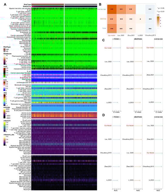Comprehensive Characterization of Immune Infiltration and Benchmarking Against Established ccRCC Prognostic Models. (A) Heatmap matrices depicting risk score correlation with deconvoluted TME features using six computational methods (CIBERSORT, EPIC, xCell, MCP-counter Absolute Score, ESTIMATE, CIBERSORT Absolute Mode). (B) Hazard ratio comparison of the CoxBoost-Ridge prognostic model against established ccRCC signatures across three independent cohorts. CoxBoost-Ridge achieved significantly higher HR across all cohorts, indicating superior risk stratification. (C) C-index of the CoxBoost-Ridge combined model and 4 published models across 3 cohorts. (D) 1-year AUC of the CoxBoost-Ridge combined model and 4 published models across 3 cohorts [,,,].