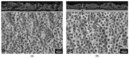 The surface morphology and cross-sections of the coatings are shown in Figure 2. All coatings have a developed porous structure. The surface of the PEO coating obtained in electrolyte P is heterogeneous: rough non-porous areas or areas with pores smaller than 1 μm alternate with areas covered with pores measuring 2.7 ± 0.7 μm (Figure 2a). The cross-section (upper part of Figure 2a) reveals discontinuities between the coating and the substrate, indicating weak adhesion of the coating. The coating is loose, with many small pores. The addition of sodium silicate leads to the formation of a glossy coating surface, the pore system becomes more uniform, and large rounded pores with a size of 3.9 ± 1 μm prevail on the surface (Figure 2b), while the porosity of the coating surface increased to 17 ± 1.7%. The cross-section shows that the coating is denser than P, with no discontinuities between the coating and the substrate. The coating consists of a dense inner layer up to 2 μm thick (indicated by arrows) and a porous outer layer 17.4 ± 1.3 μm thick (Figure 2b, upper part). The pores are deep (up to 7 μm), elongated, and interconnected. The addition of boric acid to the P and PS electrolytes led to an enlargement of the pores. The porosity of the surface of the coatings obtained in the PB electrolyte without silicate increased compared to P (Figure 2c), while in the PSB electrolyte, it decreased compared to PS (Figure 2d). The surface is heterogeneous, with smoothed areas on the pore craters alternating with rough areas. During the preparation of the cross-section, the PB sample coating was partially chipped. The PSB coating was denser.