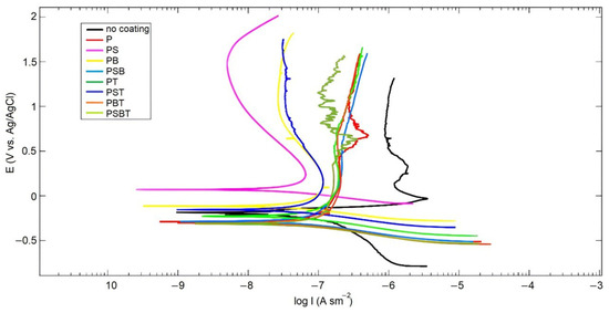 Polarization curves in Ringer’s solution for the uncoated and PEO-coated samples in various electrolyte samples.