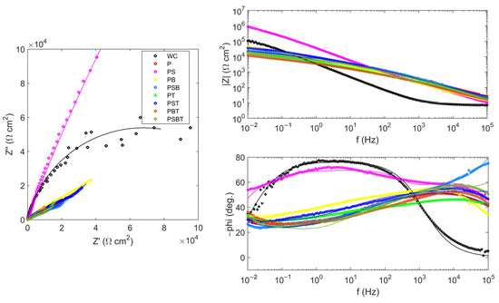The impedance spectra of samples with PEO coatings were approximated by two different circuits with two time constants. The difference in the circuits is due to the different structure, morphology, and corrosion processes occurring on the surface of PEO coatings. The impedances of the remaining samples were approximated by a circuit (Figure 5b) containing a Warburg element that reflects the diffusion processes occurring in the pores of the coating. Diffusion processes manifest themselves as an increase in the impedance of the system at an angle of 45° to the real axis with a decrease in frequency. At high frequencies, the influence of Warburg impedance is negligible, so the first semicircle is approximated by the pair R2–CPE1. From the large values of the Warburg impedance parameters Wo-R and the time constant Wo-T, it follows that diffusion processes experience great difficulties in the coating obtained in the PB electrolyte. The CPE1 element in all equivalent circuits can be considered in the first approximation as the capacitance of a double electric layer, which determines the thickness of the protective coating h~1/CPE1-Q. The highest value of CPE1-Q in the untreated sample indicates a thin oxide layer. In samples after PEO treatment, the value of CPE1-Q is lower, which qualitatively indicates a greater thickness of the oxide layer.