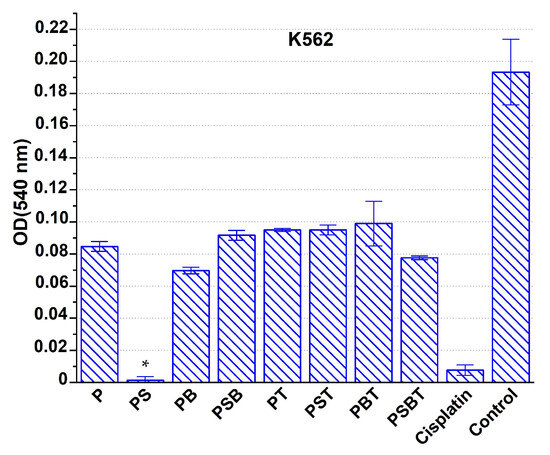 In experiments on the K562 cell line model, scaffolds with cytostatic agents were added to the cell incubation medium without changing the medium composition for the next 72 h. As a result, it was found that the addition of cisplatin loaded onto scaffolds of all types to the culture medium had a pronounced cytotoxic effect compared to the intact control (Figure 6). However, compared to the control with cisplatin directly added to the growth medium, only PS scaffold-based constructs had a similar cytotoxic effect in terms of intensity.