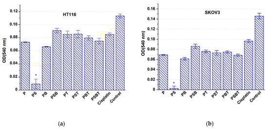 All studies were performed on at least three samples with different coatings. When analyzing the results, to identify the most effective scaffold, the antiproliferative activity of the scaffolds was compared with the effect of cisplatin added to the cell medium (cisplatin group). Differences were considered significant if the antiproliferative effect of the scaffold was more pronounced than in the cisplatin group (p < 0.05). For this purpose, the mean value and standard deviation of the values in each group were calculated, and the Mann–Whitney U test was performed using Statistica 10.0 (StatSoft, Tulsa, OK, USA).