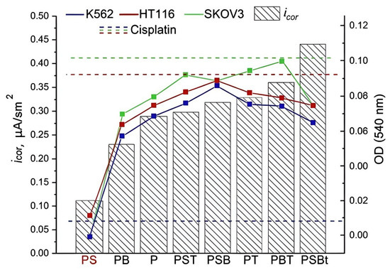 The data obtained show that scaffolds with the studied coatings promoted the fixation of cisplatin on their surface. This slowed down its release into the extracellular environment, prolonging its exposure time, which contributed to more effective inhibition of tumor cell proliferation compared to the effect of the standard form of the drug as a solution. PS scaffolds loaded with cisplatin showed the greatest effectiveness, which is probably due to the characteristics of the PEO coating. It has been established that the addition of sodium silicate to the electrolyte contributes to the formation of a dense coating with a developed system of interconnected pores that have good adhesion to the substrate. At the same time, the samples obtained in the PS electrolyte have the highest coating surface porosity, the largest pore diameter and depth, and the greatest coating thickness (Figure 2, Table 3) compared to other samples obtained in electrolytes with the addition of sodium silicate. It is likely that this combination of coating parameters allows PS scaffolds to be loaded with a large amount of the drug, contributing to its longer release and thus ensuring its prolonged effect. In addition to superior cytostatic effect, PS samples demonstrate higher corrosion resistance (Table 5, Figure 8).