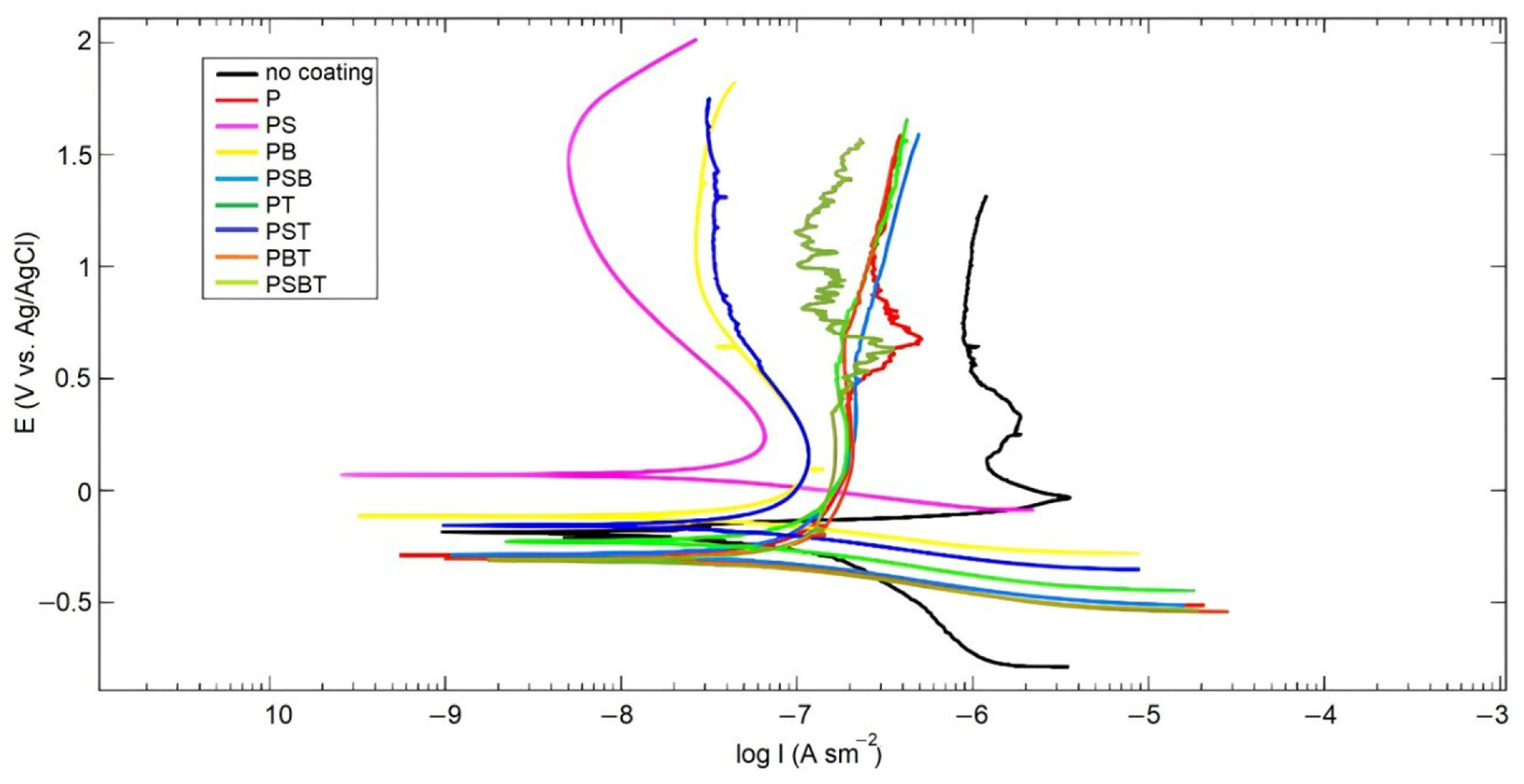 E0 = 0.222 V) and a graphite counter electrode. The electrode potential was measured for 30 min to reach a steady-state value. Next, electrochemical impedance spectroscopy (EIS) was performed in the frequency range from 100 kHz to 10 MHz relative to the steady-state electrode potential. Polarization curves were measured in the range from −600 mV to +1500 mV with a scanning rate of 0.25 mV/s relative to the electrode potential. The corrosion test duration for one sample was 6.3 h. The free corrosion potential and corrosion current were calculated using the Tafel method from the polarization curves [