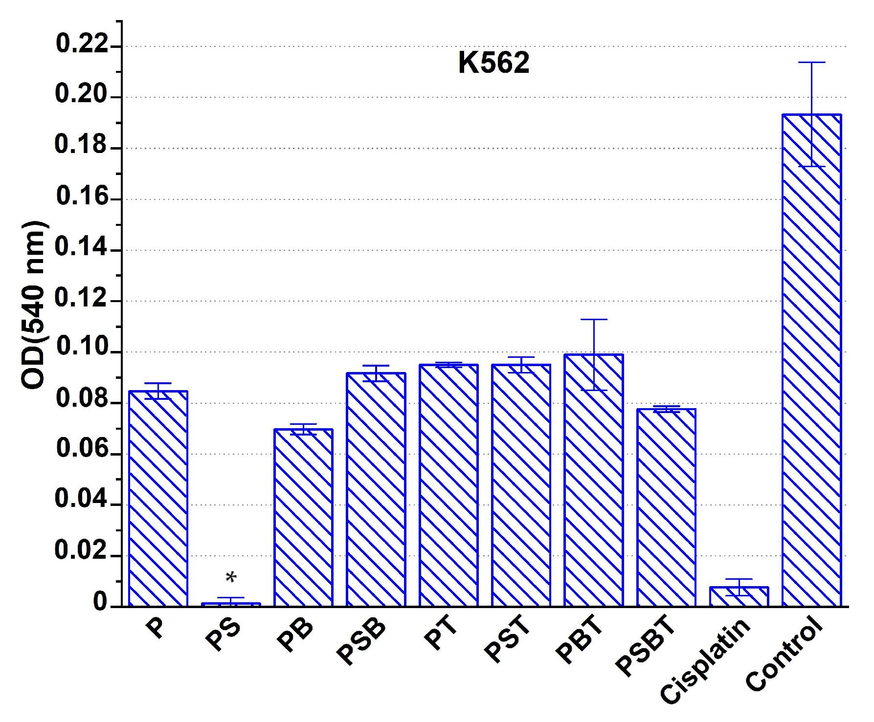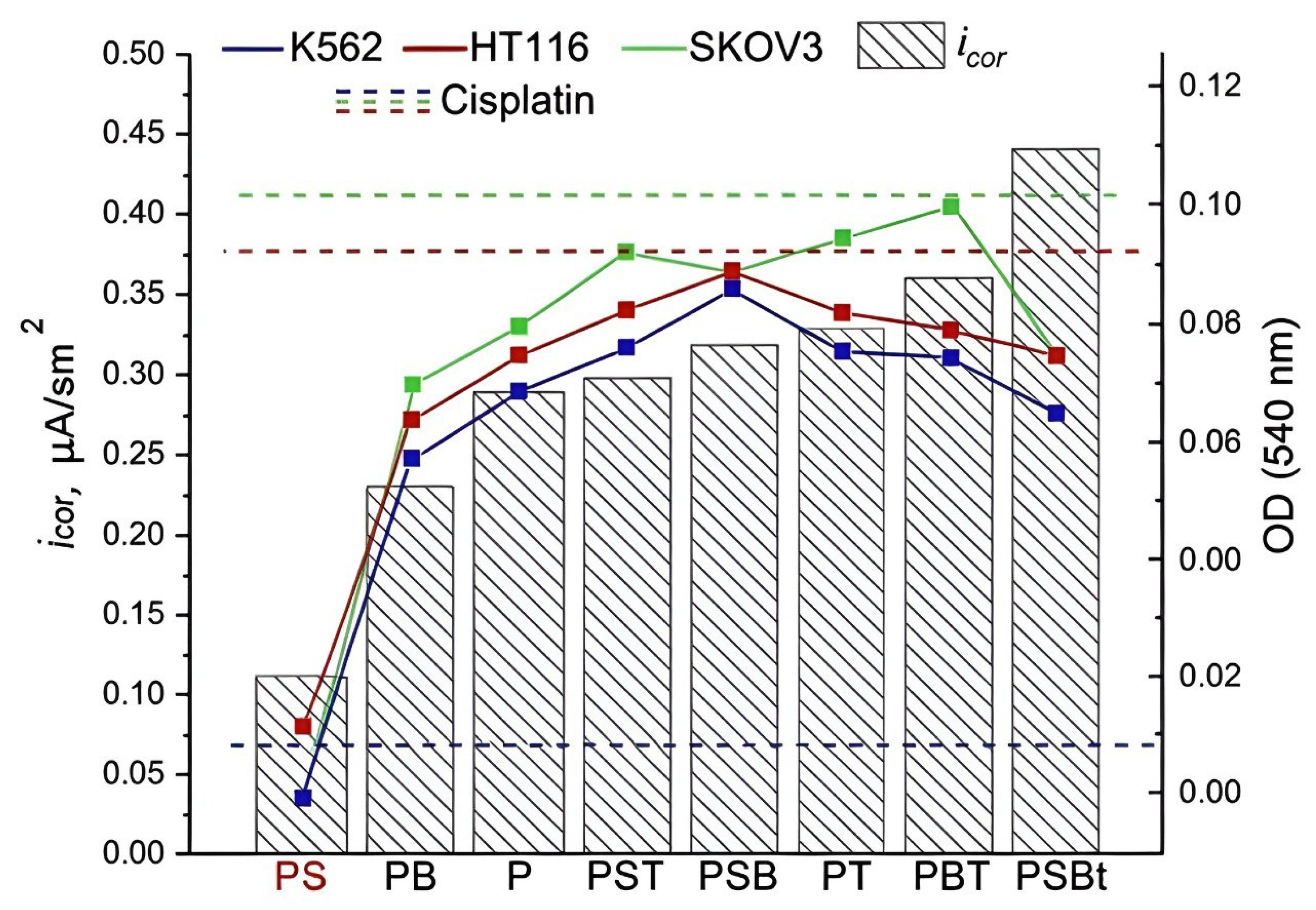In experiments on the K562 cell line model, only PS samples had a real cytotoxic effect comparable to the control group. It can be assumed that the lower cytotoxic effect of the other designs was due to the strong binding of part of the cytostatic agent to the surface of the samples, which led to a reduced concentration of the drug in the medium. Alternatively, after the initial complete dissolution of cisplatin, its re-sorption by the scaffold surface was observed. Compared to other samples, scaffolds with PS and PB coatings had the most active effect.