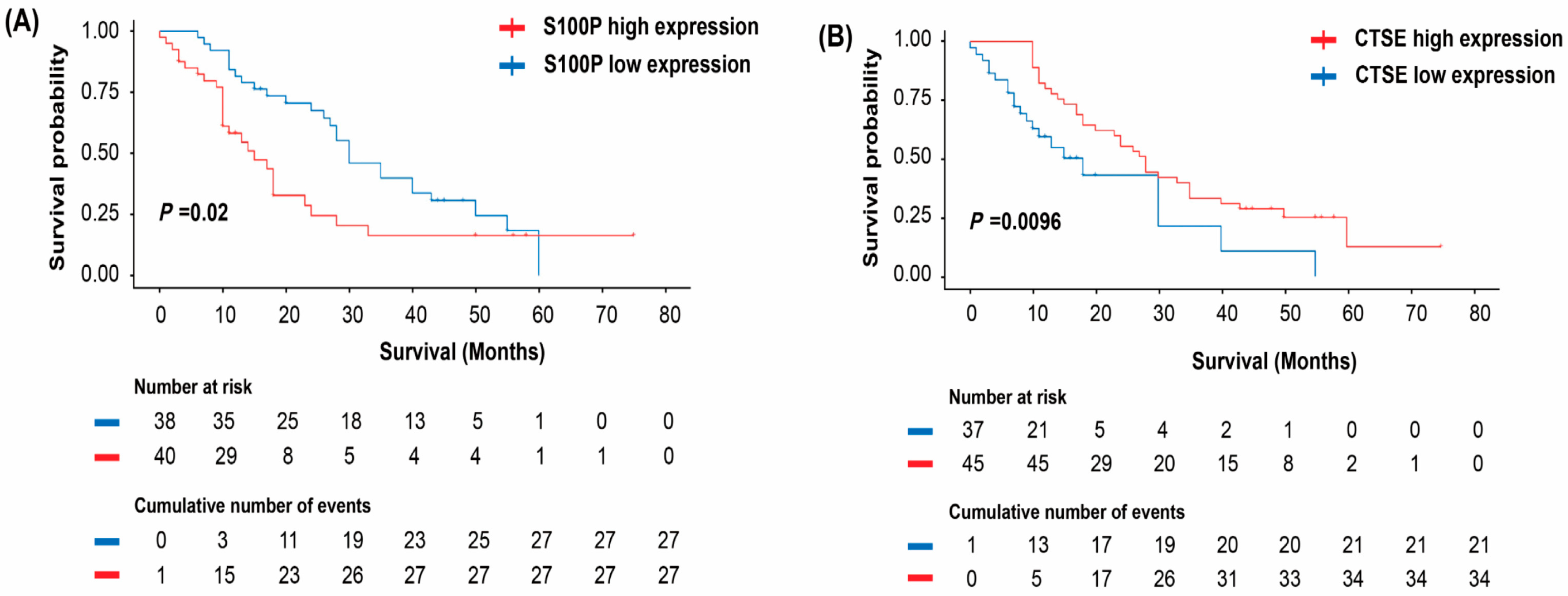 For discordant evaluations, a third blinded pathologist re-scored the slides, and final scores were determined by consensus. Of the 90 tissue pairs, 12 were excluded from S100P analysis and 8 from CTSE analysis due to suboptimal staining or insufficient tumor content, yielding 78 evaluable S100P and 82 evaluable CTSE pairs. Optimal cut-off values for survival analysis were determined via iterative Kaplan–Meier analysis to maximize discrimination in survival outcomes: S100P expression was classified as low (<180) or high (≥180), and CTSE expression as low (≤170) or high (>170).