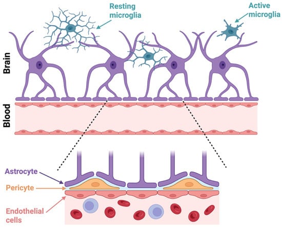 Alteration of neurogenesis is implicated in many brain pathologies, including neurodegenerative diseases []. Impairment of the normal structure of microglia can be caused by cell senescence during ageing, by intense inflammation following infections or disease, or from chronic stress exposure. As such, neurological diseases such as AD, PD, amyotrophic lateral sclerosis, depression, and schizophrenia are all hypothesised to be at least partly of microglial origin [,,]. Microglia interact closely with astrocytes, pericytes and endothelial cells at the blood–brain barrier (BBB) (Figure 1). In response to infection, injury, or disease, microglia may become activated, releasing pro-inflammatory chemicals that disrupt endothelial cells and increase BBB permeability.