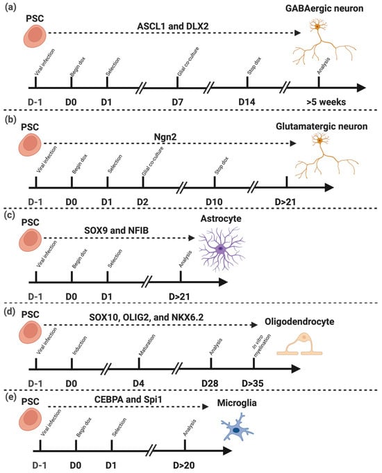 Transcription factor-driven differentiation of pluripotent stem cells (PSCs) into distinct neural cell types. Schematic representation of the differentiation protocols from PSCs into major neural lineages through the forced expression of lineage-specific transcription factors (TFs). (a) Expression of ASCL1 and DLX2 directs PSCs toward GABAergic neurons []. (b) Expression of Ngn2 promotes differentiation into glutamatergic neurons []. (c) Combined expression of SOX9 and NFIB induces differentiation into astrocytes []. (d) Co-expression of SOX10, OLIG2, and NKX6.2 drives oligodendrocyte lineage commitment and maturation []. (e) Expression of CEBPA and Spi1 leads to the generation of microglia []. These TF combinations define lineage identity and maturation timing across distinct neural cell types derived from PSCs. Note: “D” indicates Day. Dashed lines separate the different cell type differentiation protocols, and arrows indicate the progression of the experimental timeline. Created in BioRender. Mcdaid, G. (2025) https://BioRender.com/jwcbn68 (accessed on 10 November 2025).