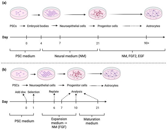 Simplified workflow for in vitro differentiation to astrocytes by: (a) Growth factor-mediated differentiation (adapted from methods described by Krencik & Zhang [] and Mormone et al. []). These methods feature long maturation times, and multiple media changes. PSCs are differentiated into embryoid bodies, neuroepithelial cells, and NPCs before maturing into astrocytes. The process involves multiple medium changes and long maturation times. Culture media include PSC medium, neural medium (NM), and NM supplemented with fibroblast growth factor 2 (FGF2) and epidermal growth factor (EGF). (b) TF-driven differentiation (Adapted from Canals et al. []). PSCs are induced into neuroepithelial and progenitor cells, followed by maturation into astrocytes using doxycycline (dox) induction and selection steps. Media include PSC medium, expansion medium transitioning to NM (with FGF), and maturation medium. Note: Solid arrows indicate the sequential progression of differentiation steps. Dashed arrows represent key experimental transitions (e.g., induction, selection, replating, or analysis time points). Created in BioRender. Mcdaid, G. (2025) https://BioRender.com/ipp1ph5 (accessed on 10 November 2025).