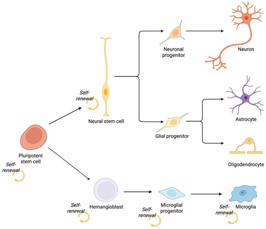 Developmental origins of central nervous system cell types. Pluripotent stem cells give rise to distinct neural and immune lineages through separate germ layers. Neurons, astrocytes, and oligodendrocytes originate from the ectodermal lineage via neural stem cells, which self-renew and generate neuronal and glial progenitors. In contrast, microglia arise from mesoderm-derived hemangioblasts, which produce microglial progenitors that populate the CNS. Created in BioRender. Mcdaid, G. (2025) https://BioRender.com/46pkjlp (accessed on 30 September 2025).
