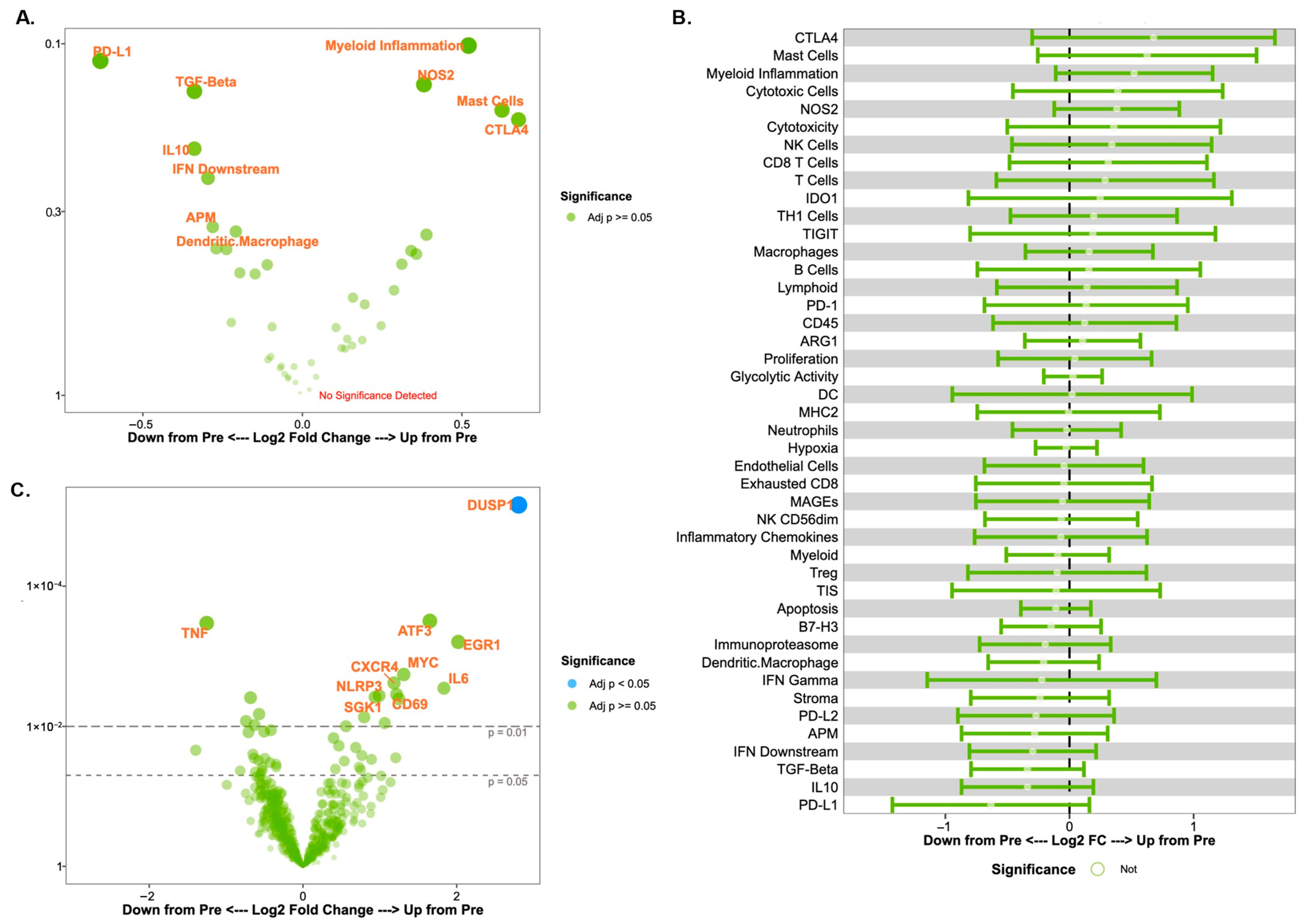 Changes in immune signatures and gene expression over time across all patients. (A) Volcano plot of cell signature scores after a single dose of trastuzumab (post-treatment vs. pre-treatment). For (A,C), each signature (A) or gene expression (C) difference between timepoints is represented along the x-axis, with the p-value along the y-axis. Signatures or gene expressions with greater statistical significance appear higher on the plot and are larger and darker in hue. Signatures or genes with greater differential expression from baseline are further from the plot center, with rightward values representing an increase in expression and leftward values representing a decrease in expression relative to baseline. Of note, the y-axis values (p-values) for (A,C) are highly exploratory in nature. (B) Forest plot of cell signature scores after a single dose of trastuzumab (post-treatment vs. pre-treatment). (C) Volcano plot of gene expression patterns after a single dose of trastuzumab.