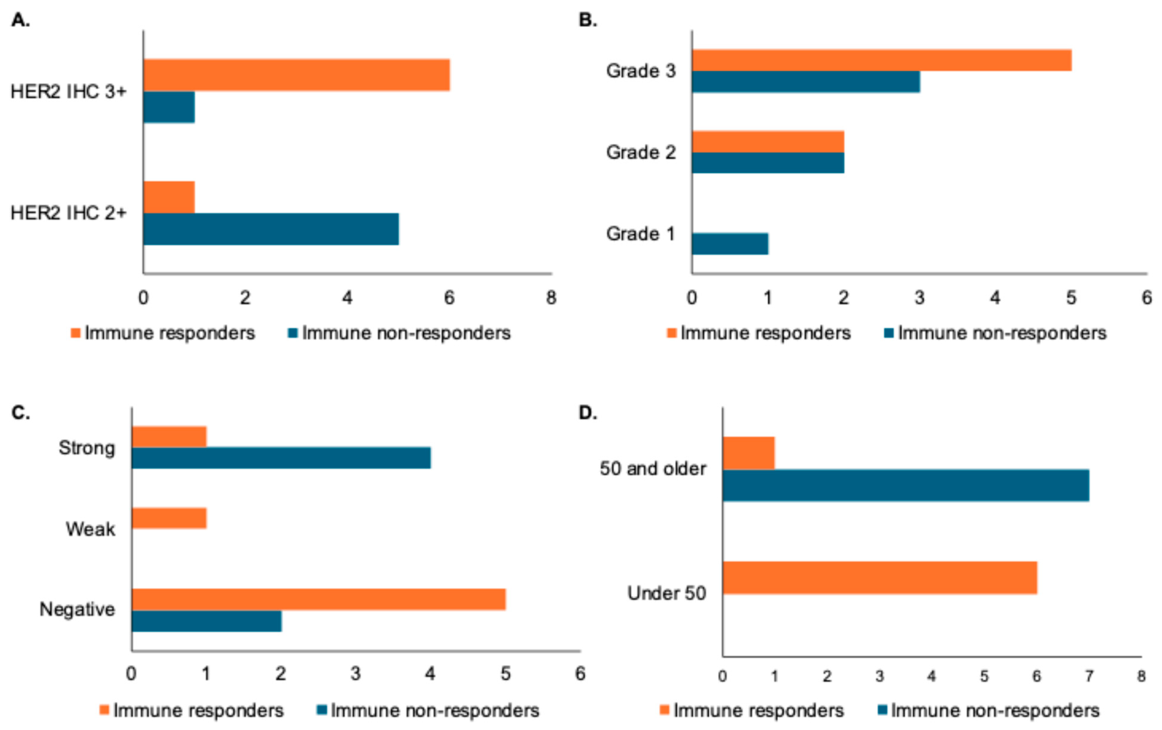 Association of pathologic and patient features with immune response as defined by changes in stromal TILs. X-axes for panels (A–D) represent number of patients. (A) Bar graph showing distribution of HER2 IHC in immune responders (increase in stromal TILs of greater than one decile) versus immune non-responders. (B) Bar graph showing histologic grade distribution in immune responders versus non-responders. (C) Bar graph showing distribution of estrogen receptor (ER) status by Allred score (with a weak distribution indicated by a score of 3–6 and a strong distribution indicated by a score of 7 or 8) in immune responders versus non-responders. (D) Bar graph showing age distribution in immune responders and non-responders.