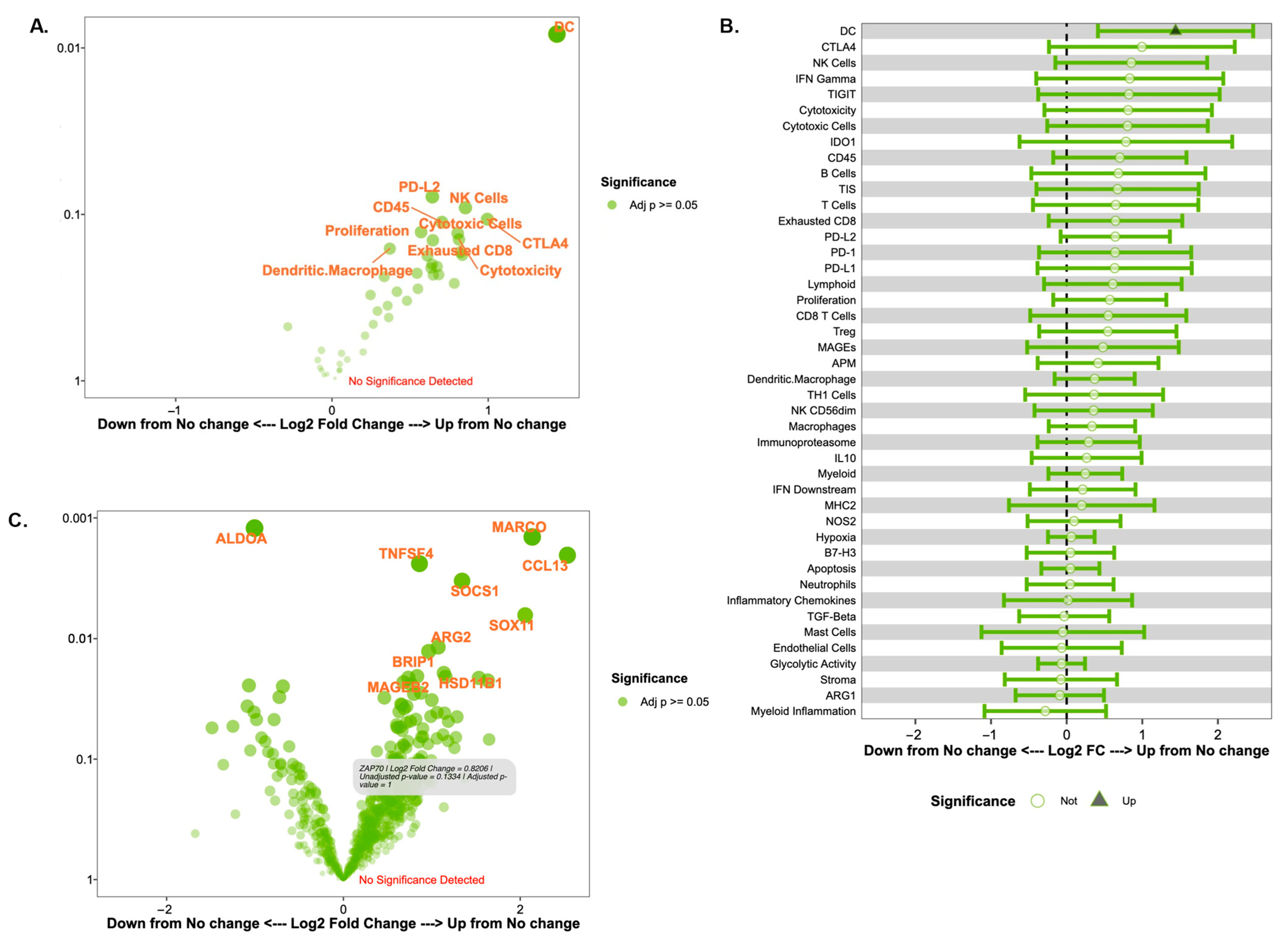 Immune signature and gene expression changes in immune responders versus non-responders as defined by changes in stromal TILs. (A) Volcano plot of immune cell signatures in TIL responders versus non-responders by fold change (difference on Log(2) scale on x-axis) and significance (p-value) on the y-axis. For (A,C), signatures or genes that have greater statistical significance appear higher on the plot with larger, darker points, while signatures or genes that have a greater differential expression appear further from the center of the plot. Genes further to the right indicate an increase in expression, while genes further to the left indicate a decrease in expression relative to the baseline group. Of note, the y-axis represents p-values that are for exploratory analysis only. (B) Forest plot of cell signatures in TILs responders versus non-responders. (C) Volcano plot of gene expression patterns based on a change in TIL responders versus non-responders.