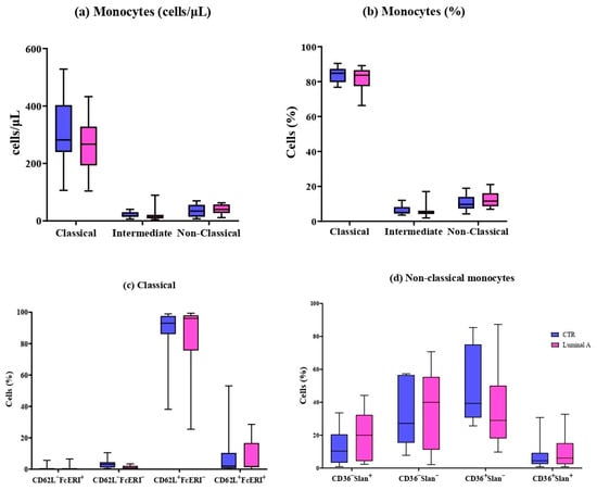 Peripheral blood monocyte subsets in control (blue) and luminal A patients (pink). (a) Absolute counts (cells/μL) and (b) percentages of classical, intermediate, and non-classical monocytes. (c) CD62L and FcεRI expression in classical monocytes. (d) CD62L, FcεRI, and HLA-DR expression in non-classical monocytes. Boxes show median and interquartile range.