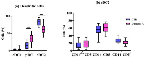 Comparison of dendritic cell subsets between controls (CTR) and Luminal A patients. (a) Frequencies of cDC1, pDC, and cDC2 in peripheral blood. (b) Phenotypic profile of cDC2 based on CD15, CD5, and CD14 expression. Boxes show median and interquartile range. Statistical analysis was performed using the Mann–Whitney test. *** p < 0.001 was considered significant.