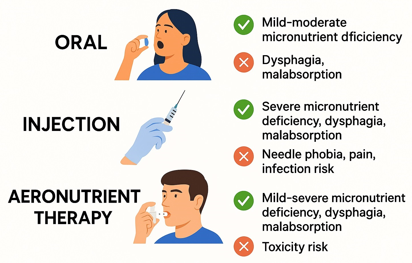 - The need for direct comparisons of the efficacy, safety, compliance and cost of the different routes of micronutrient administration (oral, intramuscular and inhaled);
