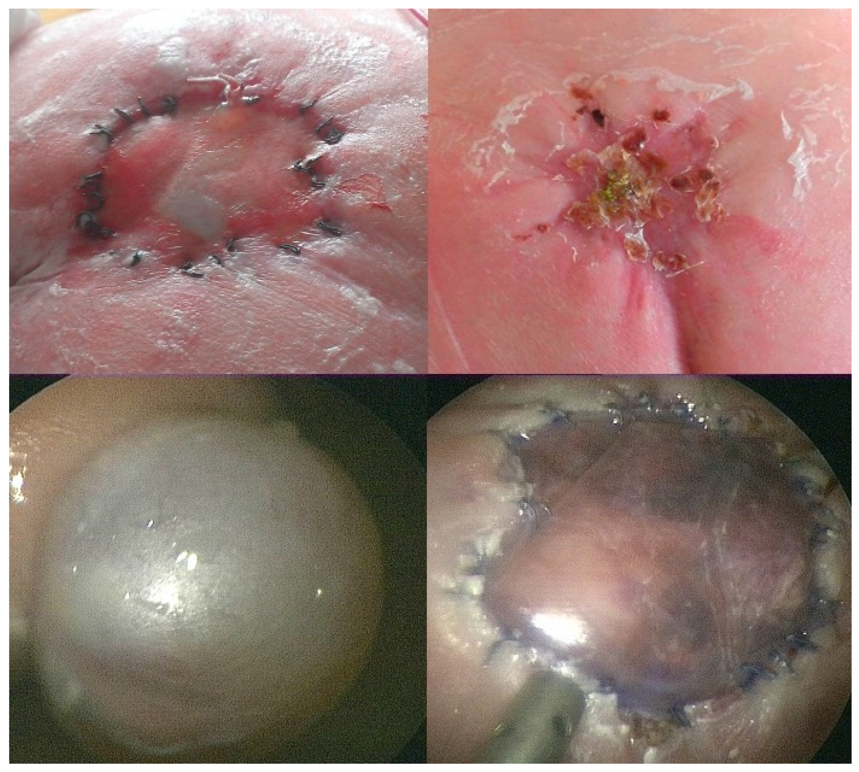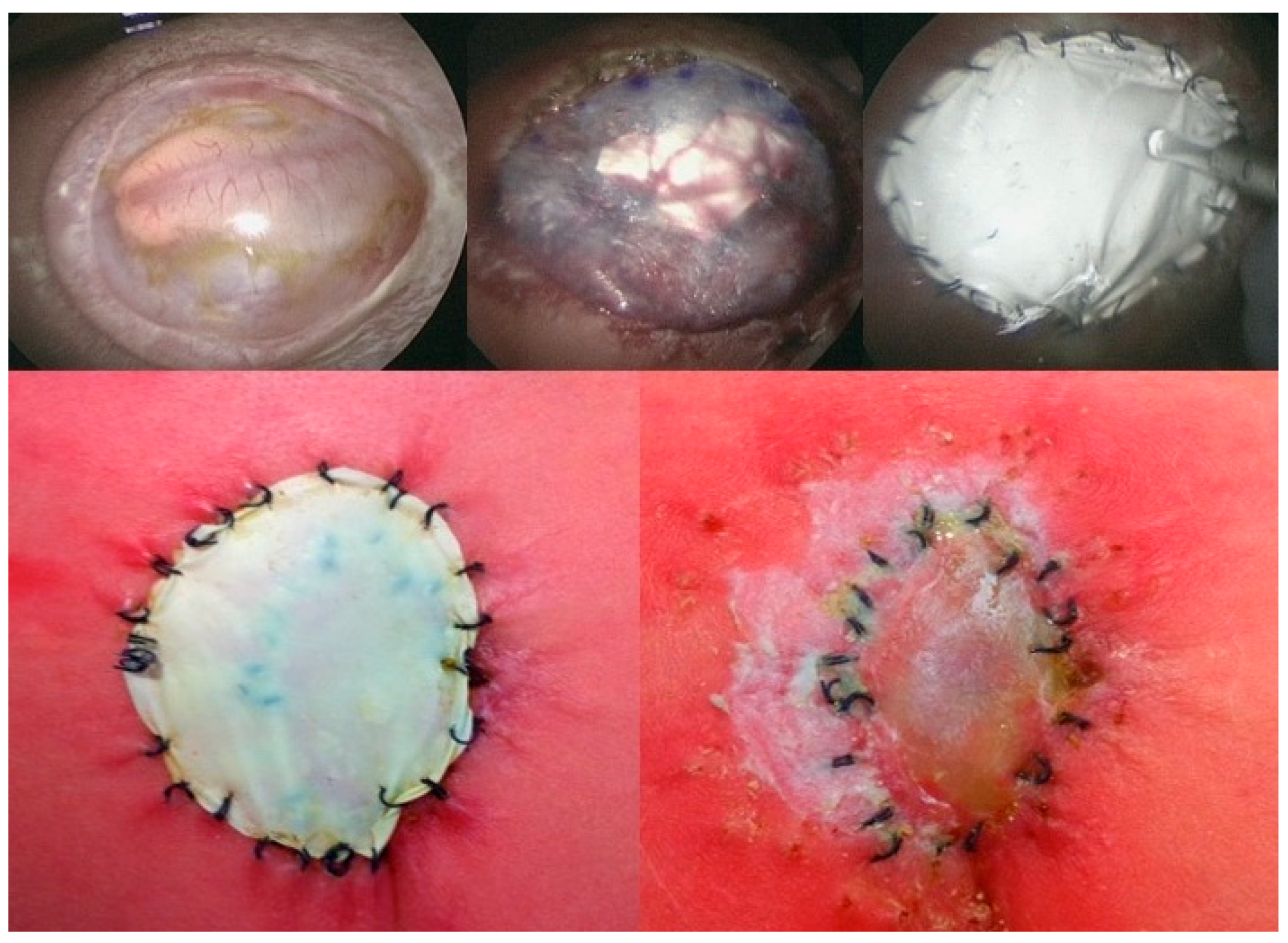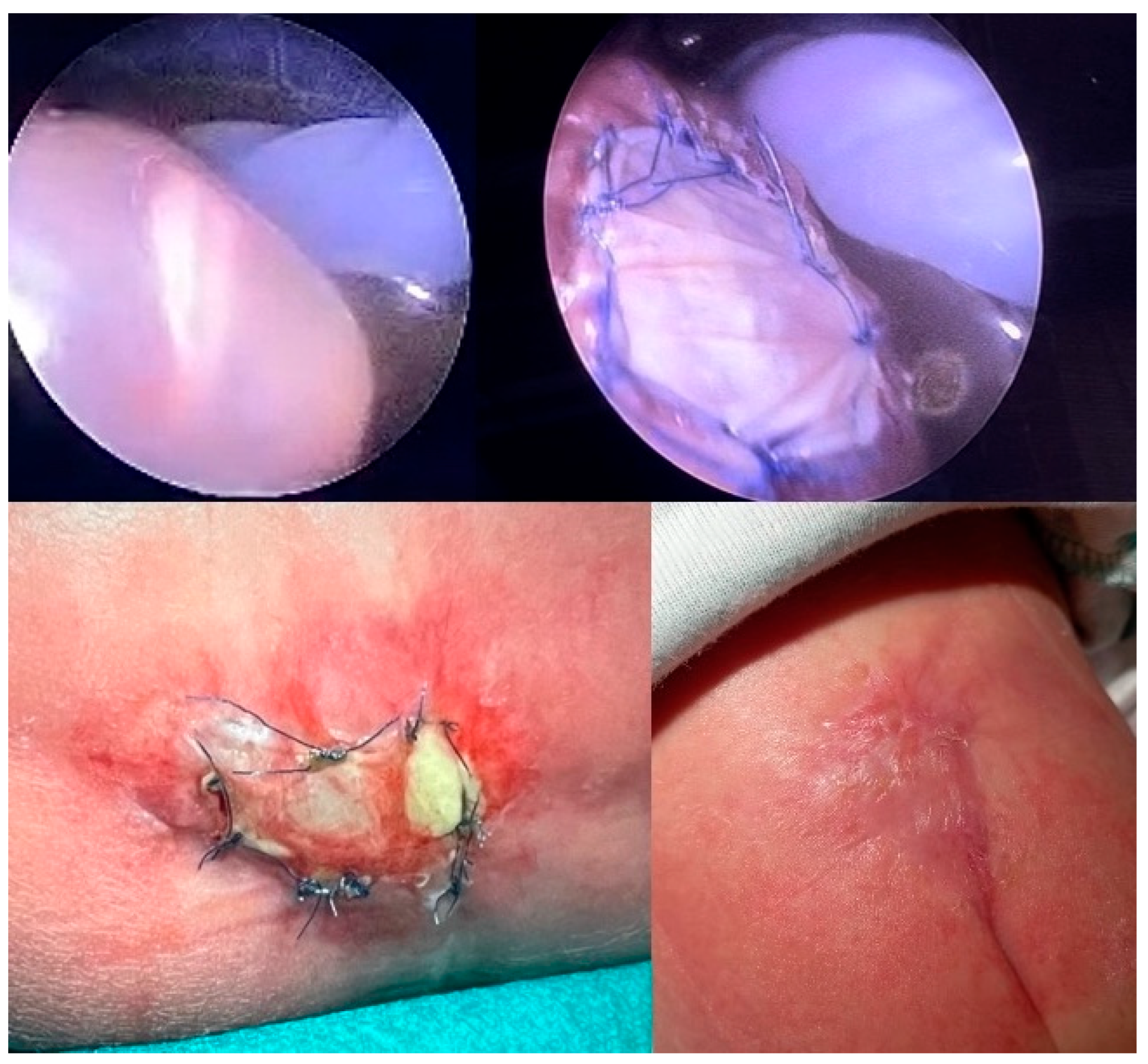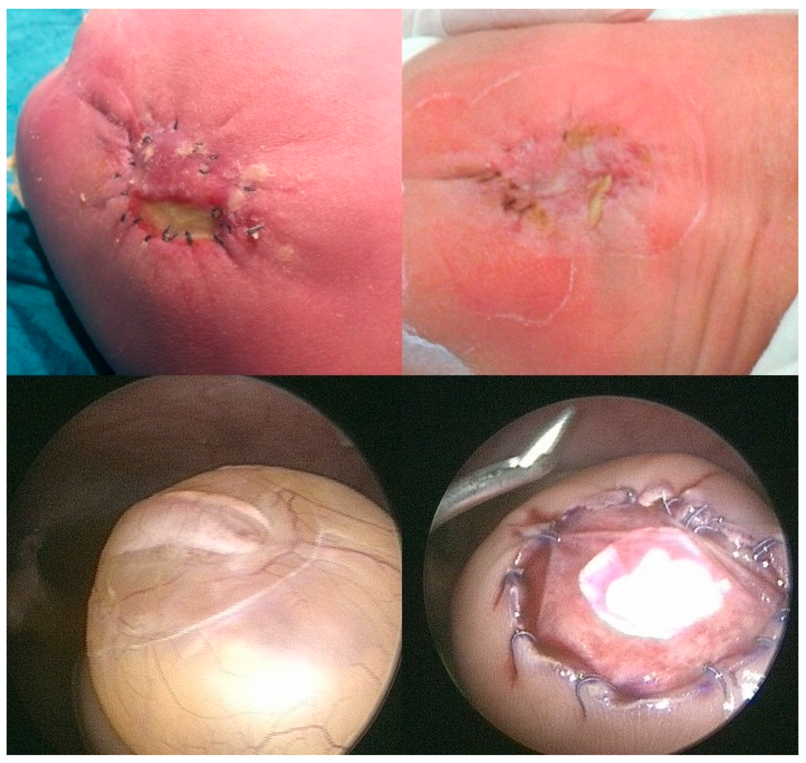 - Kohl, T.; Große Hartlage, M.G.; Kienitz, D.; Westphal, M.; Buller, T.; Achenbach, S.; Aryee, S.; Gembruch, U.; Brentrup, A. Percutaneous fetoscopic patch coverage of experimental lumbosacral full- thickness skin lesions in sheep—A minimally invasive technique aimed at minimizing maternal trauma from fetal surgery for myelomeningocele. Surg. Endosc. 2003, 17, 1218–1223. [Google Scholar] [CrossRef] [PubMed]