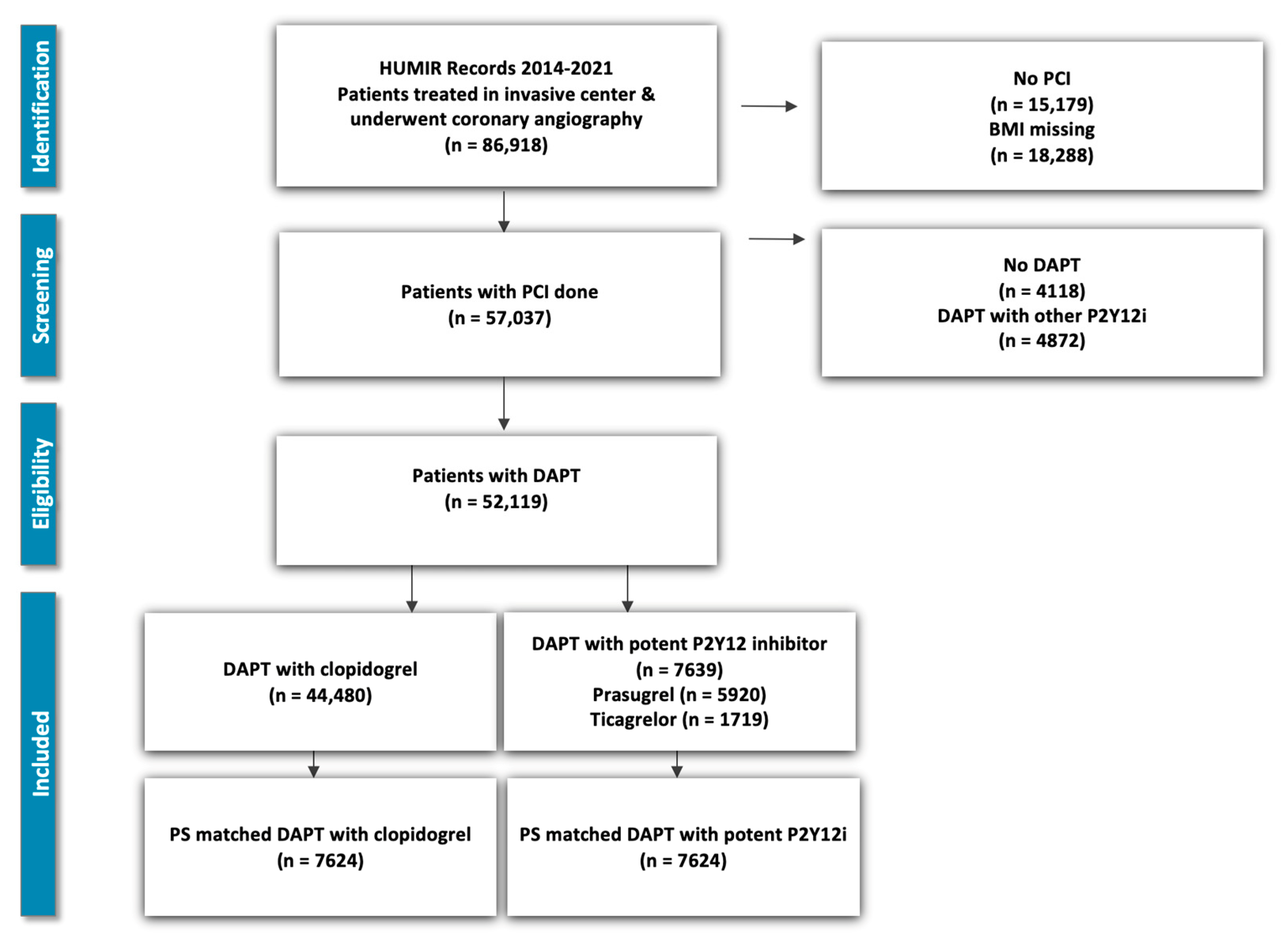 - Komócsi, A.; Merkely, B.; Hadamitzky, M.; Massberg, S.; Rizas, K.D.; Hein-Rothweiler, R.; Gross, L.; Trenk, D.; Sibbing, D.; Aradi, D. Impact of body mass on P2Y12-inhibitor de-escalation in acute coronary syndromes—A substudy of the TROPICAL-ACS trial. Eur. Heart J. Cardiovasc. Pharmacother. 2023, 9, 608–616. [Google Scholar] [CrossRef]