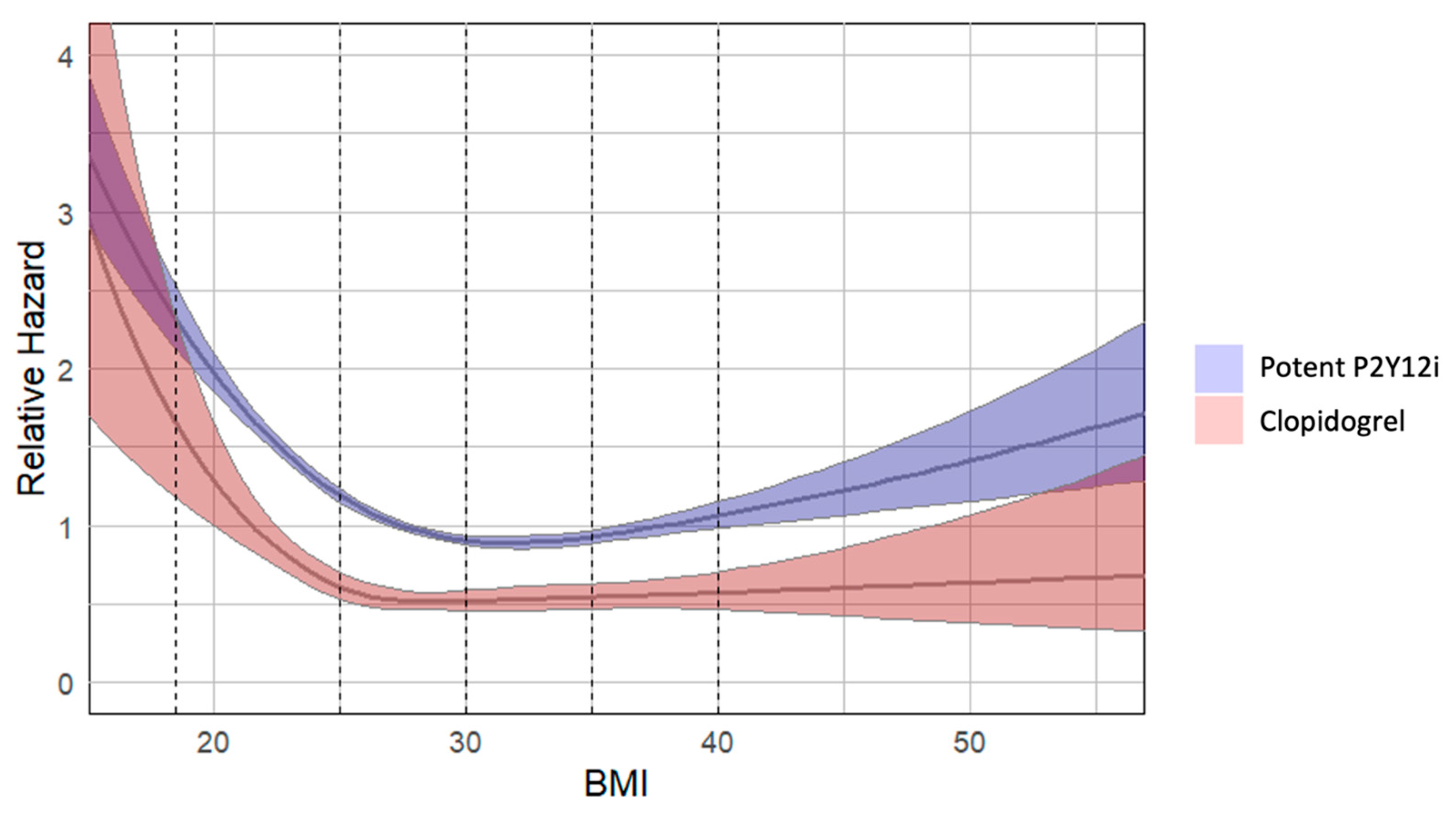 | Clinical Endpoint | Hazard Ratio Clopidogrel Versus P2Y12i | Hazard Ratio BMI (per 5-Unit Increase) | p Value Interaction |