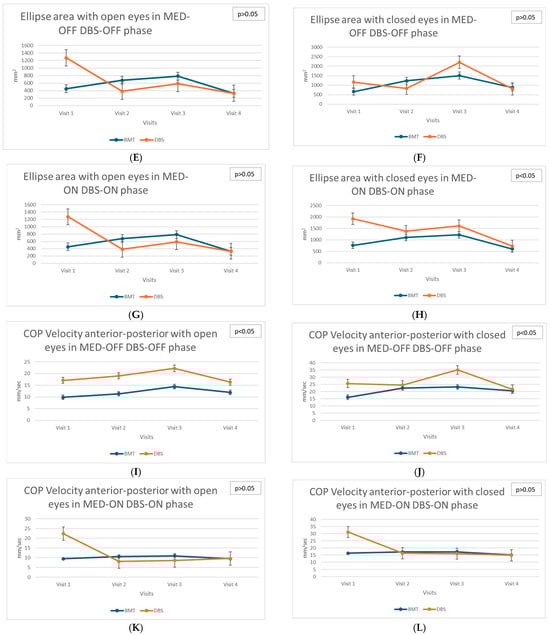 (A)—Longitudinal assessment: Perimeter with open eyes in MED-OFF DBS-OFF phase. (B)—Longitudinal assessment: Perimeter with closed eyes in MED-OFF DBS-OFF phase. (C)—Longitudinal assessment: Perimeter with open eyes in MED-ON DBS-ON phase. (D)—Longitudinal assessment: Perimeter with closed eyes in MED-ON DBS-ON phase. (E)—Longitudinal assessment: Ellipse area with open eyes in MED-OFF DBS-OFF phase. (F)—Longitudinal assessment: Ellipse area with closed eyes in MED-OFF DBS-OFF phase. (G)—Longitudinal assessment: Ellipse area with open eyes in MED-ON DBS-ON phase. (H)—Longitudinal assessment: Ellipse area with closed eyes in MED-ON DBS-ON phase. (I)—Longitudinal assessment: COP Velocity anterior–posterior with open eyes in MED-OFF DBS-OFF phase. (J)—Longitudinal assessment: COP Velocity anterior–posterior with closed eyes in MED-OFF DBS-OFF phase. (K)—Longitudinal assessment: COP Velocity anterior–posterior with open eyes in MED-ON DBS-ON phase. (L)—Longitudinal assessment: COP Velocity anterior–posterior with closed eyes in MED-ON DBS-ON phase.