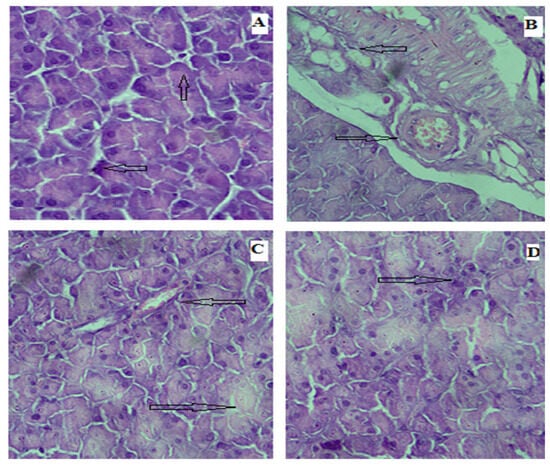 Photomicrographs of microsections of the pancreas of rats: (A) control group showing the normal histological structure of islets of Langerhans with normal pancreatic acini; (B) diabetic group showing ruptured and destroyed islets of Langerhans with damage in beta cells; and (C,D) Rp-Nc 0.5 mg- and 1 mg-treated groups showing some normal islets of Langerhans with some mild destruction in normal pancreatic ducts and in between normal pancreatic acini (H&E scale bar, 25 µm).