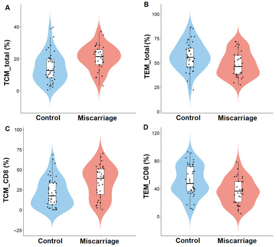 Distribution of endometrial memory T-cell subsets in women with (miscarriage group) and without (control group) previous miscarriage. Violin plots show the relative abundance of (A) total central memory T cells (TCM_total), (B) total effector memory T cells (TEM_total), (C) CD8+ central memory T cells (TCM_CD8), and (D) CD8+ effector memory T cells (TEM_CD8). Lines represent median and interquartile range. p < 0.05 was considered significant.