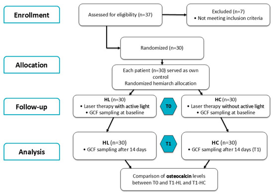 GCF was collected from the tooth that will change its position, at baseline, before the activation of the orthodontic appliance (time T0) and 14 days after its activation (time T1) from the control hemiarch (HC) and laser hemiarch (HL), with special strips contained in the analysis kit. A strip for the analysis of OC in GCF was inserted buccally, in the tension area determined by orthodontic movement. Thus, for each patient, we used three strips, one at T0 and two at T1 (one for HC and one for HL).