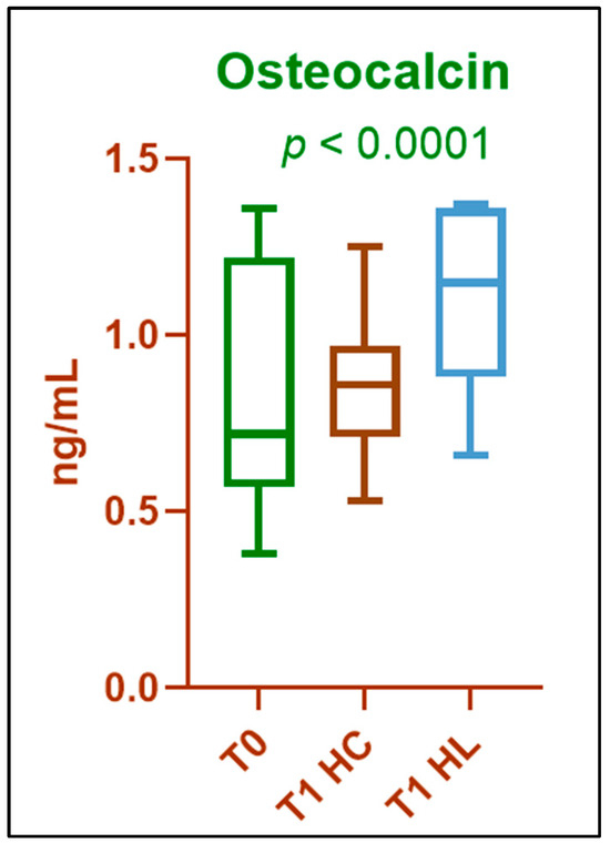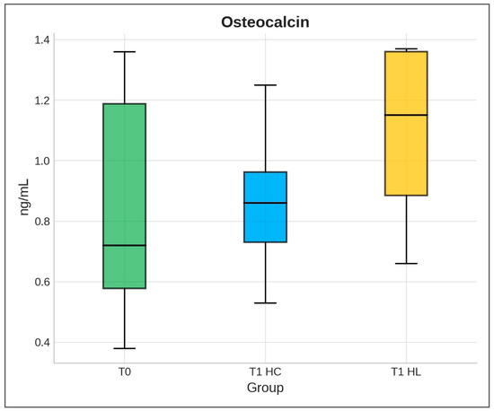 OC values at T0 and T1 for HL differed significantly (Wilcoxon test, p < 0.0001, median difference = 0.28, 95% CI: 0.21–0.34, n = 30). The effect size was large (r ≈ 0.88). No statistically significant difference was detected when comparing osteocalcin values in HC between baseline and T1 (Wilcoxon test, p = 0.2422, median difference = 0.0200, 95% CI: 0.10–0.50, n = 30). The effect size was small (r ≈ 0.18). A statistically significant difference was observed between HC and HL at T1 (Mann–Whitney U test, p < 0.0001, median difference = 0.2900, 95% CI: 0.230–0.350, n = 30). The effect size was large (r ≈ 0.89) (Figure 2).