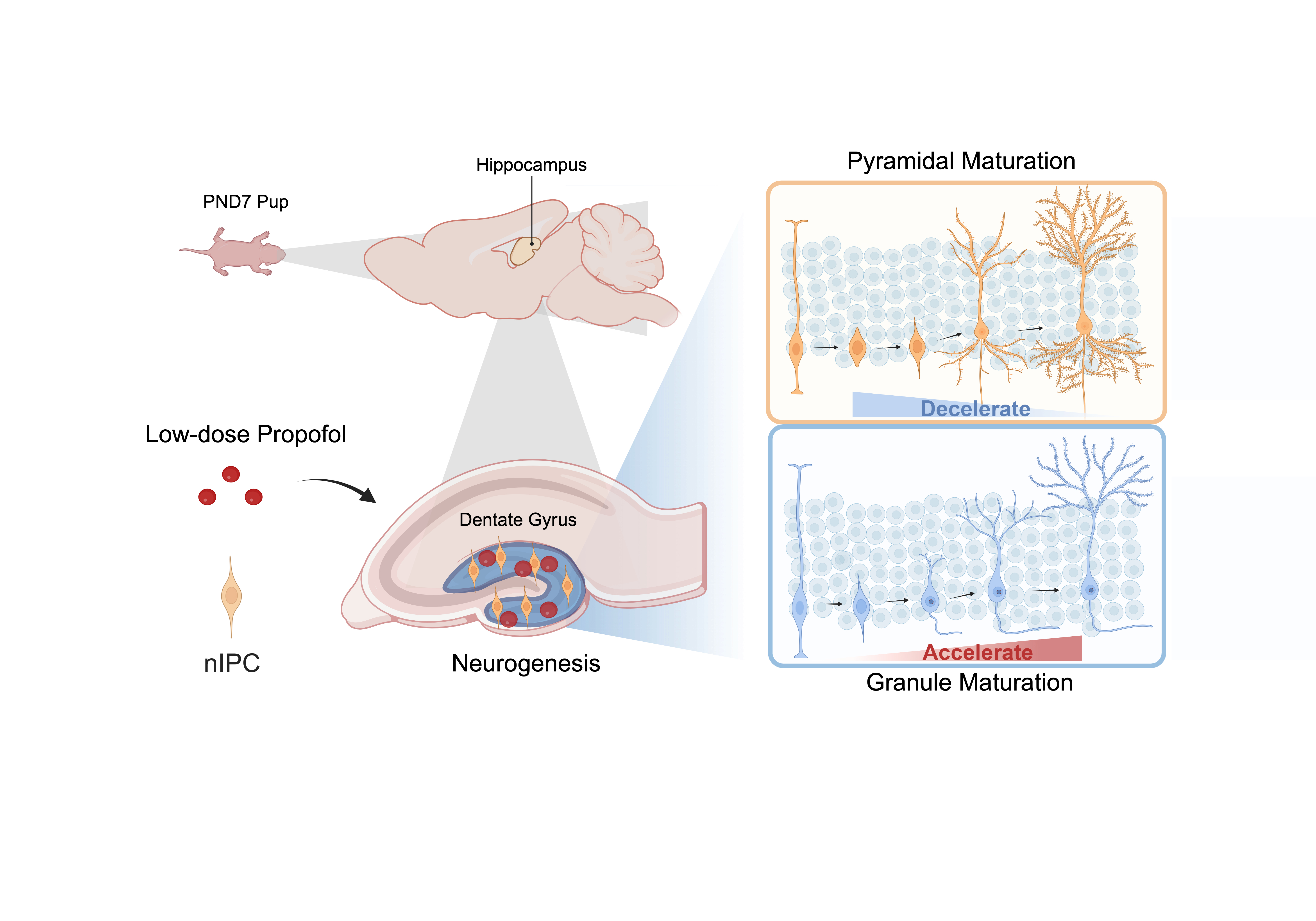 The effects of anesthetics on the development of the immature brain remain incompletely characterized. In this study, we utilized a previously established snRNA-seq dataset to perform reclustering and redefinition of hippocampal cells in PND10 mice following low-dose propofol treatment. For the first time, we identified a population of “immature pyramidal neurons” in the hippocampus at this developmental stage. Our findings suggest that propofol may redirect neurogenic differentiation from the pyramidal lineage toward granule maturation. After defining six granule neuron maturation-associated subpopulations, we further analyzed transcriptional differences between groups. We found that propofol primarily affects nIPC, which exhibits the highest stemness. At this stage, propofol preferentially activates neurogenic programs that promote neuronal maturation. Moreover, we identified Nrxn signaling as a key mediator associated with NPC activation. Collectively, these findings indicate that low-dose propofol not only redirects hippocampal neurogenic trajectories during early postnatal development but also exerts its cognitive-enhancing effects primarily by stimulating NPC at their highest stemness state.