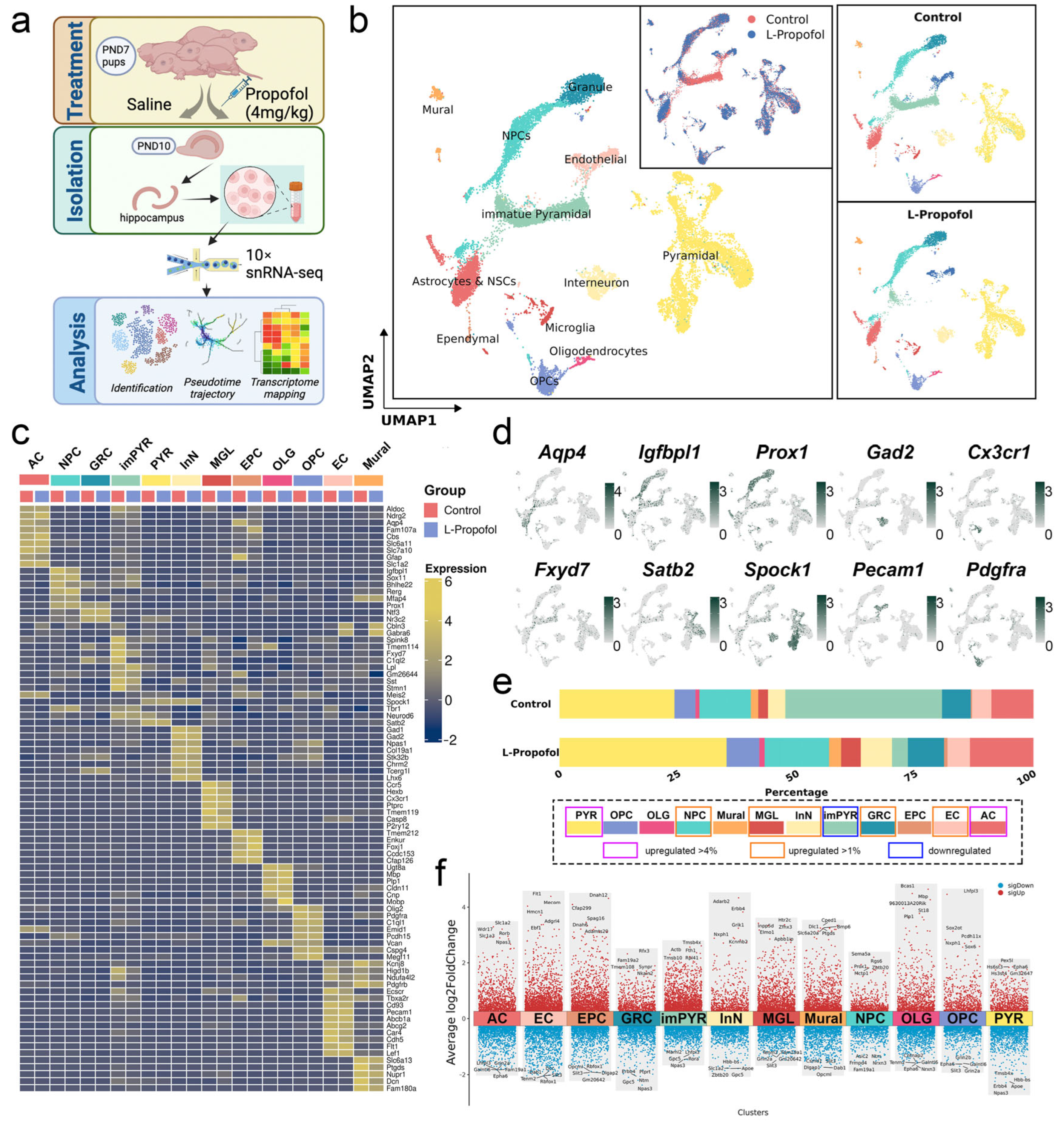 Figure 1. Single-nucleus transcriptomic profiling reveals propofol-induced shifts in hippocampal cell populations: (a) Schematic of hippocampal sample collection and processing. (b) UMAP embedding of all hippocampal nuclei, colored by cluster annotation (left). Integration plot of cells from both Control and L-Propofol groups (top center), with separate UMAPs showing the distribution of annotated cell types in the Control group (top right) and in the L-Propofol group (bottom right). (c) Heatmap of the mean expression levels of marker genes defining the 12 annotated cell types under each treatment condition. (d) UMAP feature plots for key lineage-specific markers; high expression is shown in green and low expression in gray. (e) Bar graph depicting proportional changes in each cell population following L-Propofol treatment. (f) Volcano plot of differentially expressed genes across all subpopulations, with upregulated genes in red and downregulated genes in blue; the top five most significant DEGs are labeled. Annotations: AC (astrocytes & neural stem cells), NPC (neural progenitor cells), GRC (granulocytes), imPYR (immature pyramidal cells), PYR (pyramidal cells), InN (interneurons), MGL (microglia), EPC (ependymocytes), OLG (oligodendrocytes), OPC (oligodendrocyte precursor cells), EC (endothelial cells), and Mural (mural cells).