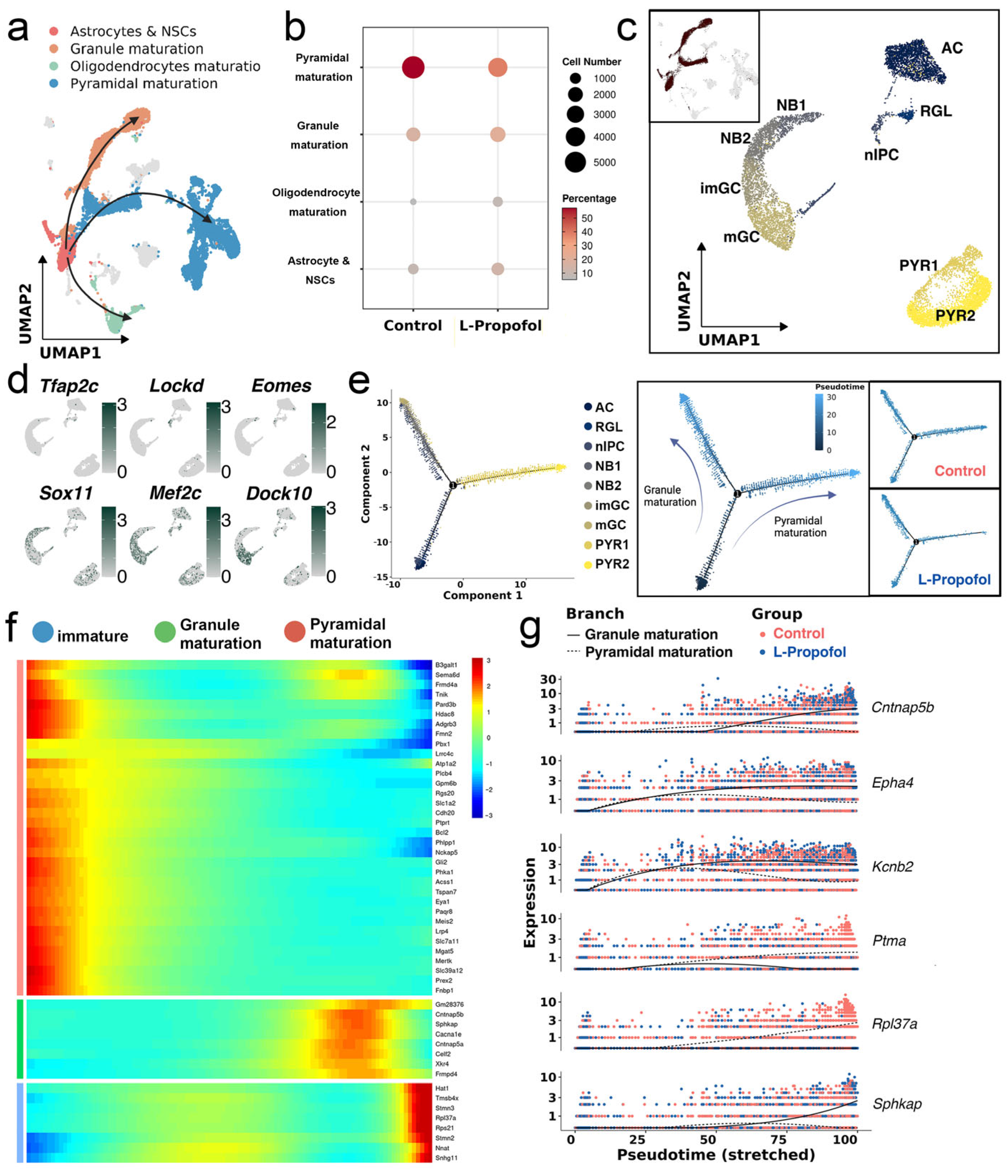 Figure 2. Low-dose propofol redirects hippocampal neurogenic trajectories: (a) UMAP embedding of 4 neurogenesis-associated differentiation directions, colored by cluster annotation. (b) Dot plot showing the proportion of each neurogenic subpopulation in Control and L-Propofol groups; dot size reflects relative abundance. (c) UMAP embedding of the re-clustered neurogenic cells, with 9 refined subclusters color-coded by annotation. (d) UMAP feature plots for representative differentially expressed genes across the subclusters; green indicates high expression and gray low expression. (e) Monocle2 trajectory analysis of the 9 subclusters: combined trajectory colored by cluster annotation (left), pseudotime progression from dark (origin) to light (terminal) (middle), and separate trajectories for Control (top right) and L-Propofol (bottom right) groups. (f) Heatmap of the top 50 branch-dependent genes identified by BEAM, illustrating transcriptional bifurcation at the lineage branch point. (g) Scatter plot of the top six branch-specific differential genes, showing their expression dynamics along the pseudotime axis. Annotations: AC (astrocytes), RGL (radial glia-like cells), nIPC (neural intermediate progenitor cells), NB1 (neuroblasts 1), NB2 (neuroblasts 2), imGC (immature granulocytes), mGC (mature granulocytes), PYR1 (pyramidal cell 1), and PYR2 (pyramidal cell 2).