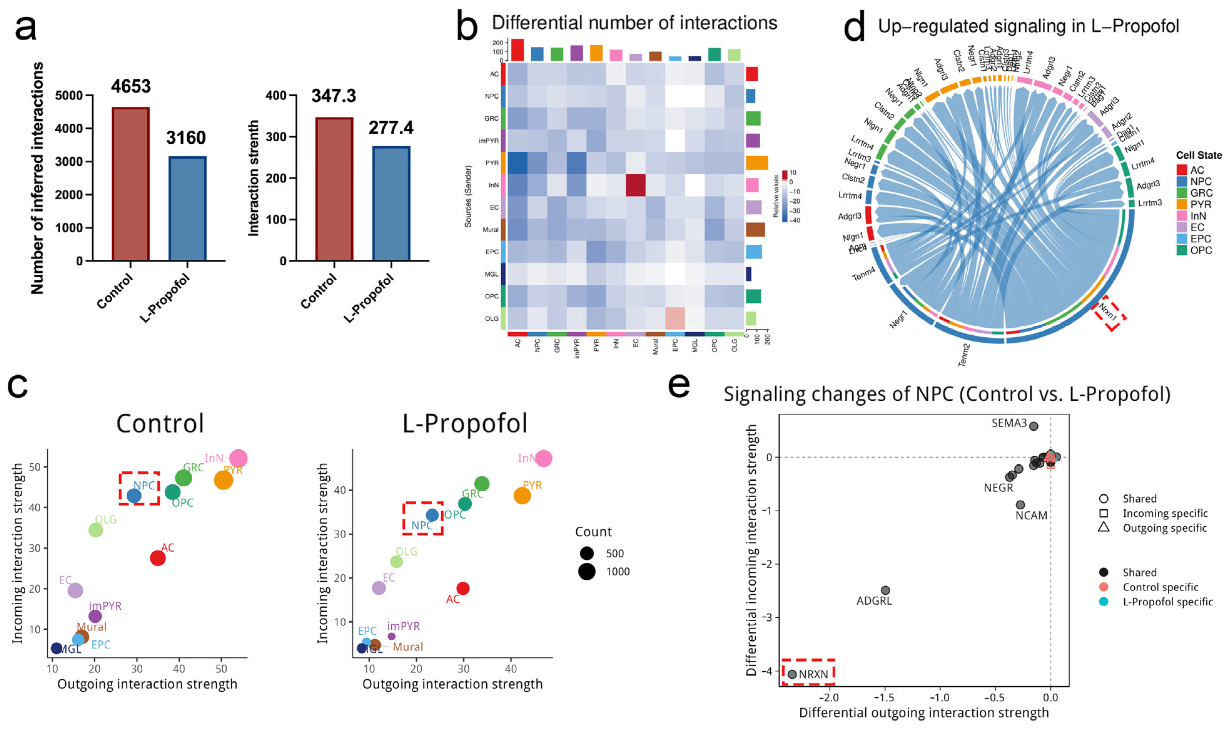 Figure 4. CellChat analysis reveals Nrxn signaling dominance in NPC following L-propofol treatment: (a) Bar plots quantify interaction numbers and communication strength across cell populations in the Control versus L-propofol groups. (b) Heatmap displays interpopulation interaction counts, revealing a marked reduction in total cellular communication events following L-propofol treatment. Red/blue gradients denote signaling enrichment in Control/L-propofol groups, respectively. Cell subtypes are color-coded as indicated. (c) Communication role analysis identifies NPC as predominant signal receivers across all lineages after low-dose propofol exposure, visualized through source-target probability matrices. (d) Circos plot visualizes significantly upregulated ligand-receptor pairs between NPC and all populations in the L-Propofol group, with lower/upper semicircles representing ligands/receptors. Ribbon width correlates with interaction strength. The red dashed box highlights the Nrxn1 signaling pathway. (e) Differential signaling analysis shows enhanced outgoing and incoming interactions in Nrxn pathways in NPC after low-dose propofol exposure. Circle indicates conserved pathways; square marks incoming-specific signals; triangles mark outgoing-specific signals. Black/red/green colors denote share/Control/L-Propofol-specific signals. Annotations: Nrxn (Neurexin), NPC (neural progenitor cells), L-Propofol (low-dose propofol).