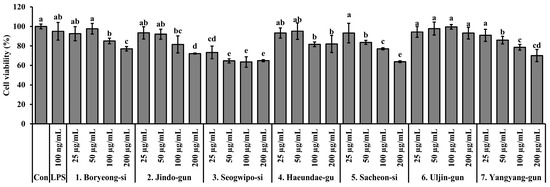 Cytotoxicity of S. thunbergii extracts from seven different coastal regions of Korea in RAW 264.7 macrophages treated with LPS (100 ng/mL). Cells were treated with 25, 50, 100, and 200 µg/mL of each extract for 24 h, and viability was measured using the MTT assay. Results are presented as mean ± SD (n = 3). Statistical analysis was performed using one-way ANOVA followed by Duncan’s multiple range test (p < 0.05). Different letters above the bars indicate statistically significant differences between treatment groups. Con indicates the untreated control group, and LPS indicates the lipopolysaccharide-treated group.