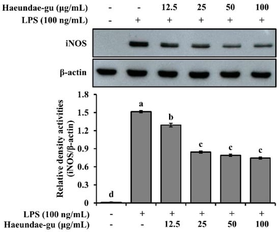 Western blot analysis of iNOS and β-actin expression in LPS-stimulated RAW 264.7 cells treated with S. thunbergii extract collected from Haeundae-gu (12.5–100 μg/mL). The iNOS protein levels were normalized to β-actin, and the relative intensities are shown in the bar graph. Treatment with the extract led to a concentration-dependent suppression of iNOS expression. Data are expressed as mean ± SD (n = 3). Different letters above the bars indicate statistically significant differences among treatment groups based on one-way ANOVA followed by Duncan’s multiple range test (p < 0.05).