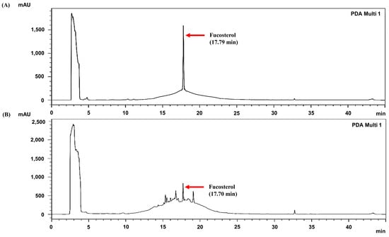 HPLC chromatograms (230 nm) of (A) fucosterol standard and (B) S. thunbergii extract from Haeundae-gu. Red arrows indicate the retention time of fucosterol.