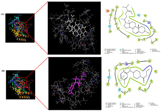Molecular docking visualization of fucosterol (A) and AT2 (Ethyl 4-[(4-methylpyridin-2-yl)amino]piperidine-1-carboxylate) (B) within the active site of iNOS (PDB ID: 3E7G). Each panel presents the overall 3D binding pose in ribbon and surface views (left), an enlarged 3D view of the ligand within the binding pocket (middle), and the 2D ligand–residue interaction diagram (right). All docking simulations were performed using Schrödinger Glide Schrödinger Glide (2025-4; Schrödinger).