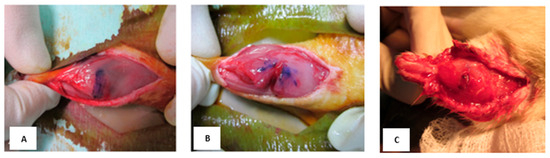 Macroscopic appearance of an intact and lacerated muscle. (A) Intact muscle marked for wound creation; (B) laceration injury model; (C) healed muscle at 7 days post-treatment with BM-MSCs.