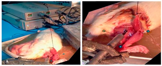 Rats were anaesthetised using an intraperitoneal injection of 50 mg/kg (100 mg/mL) of ketamine hydrochloride and 5 mg/kg (20 mg/mL) of xylazine hydrochloride. After 15 min, the animal was placed in a prone position, and a longitudinal skin incision was made to expose the right gastrocnemius muscle (Figure 1). A laceration injury model was created by dissecting the muscle in a standardised manner, i.e., at the point of 60% of the muscle length from the distal insertion, through 75% of the width and 50% of the thickness. The fascia was closed using Vicryl absorbable sutures, and the skin overlaying the muscle was closed with 4-0 black silk sutures. The laceration was only performed on the right leg, whilst the left leg served as the individual control for the respective animal.
