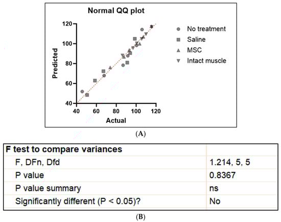 (A) Q–Q plots showing no major deviations from normality. (B) Output from Levene’s test (F-test). Homogeneity of variances was verified based on the results showing equal variances among groups (p = 0.8367). ns denotes non-significant results.