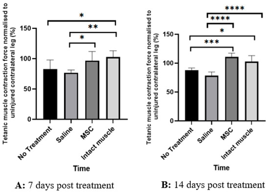 Tetanic muscle contraction normalised to the contralateral uninjured leg (%). Comparison of muscle force recovery of injured muscle relative to contralateral normal muscle among the untreated, saline-treated, MSC-treated, and intact muscle groups on day 7 (A) and day 14 (B) post-treatment, following a 2-week delay after injury. Data are presented as mean ± SD (6 subjects per group). Statistical significance among groups was determined using one-way ANOVA followed by Tukey’s post hoc test. * p < 0.05, ** p < 0.01, *** p < 0.001, **** p < 0.0001 compared to the indicated groups.