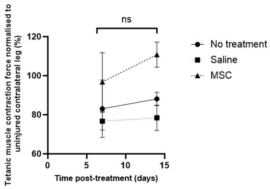 The results of this pilot investigation should be interpreted in light of certain methodological limitations. It is worth noting that conducting a reliable physiological measurement of muscle strength poses technical challenges, which may have contributed to the increased variability of muscle force measurement observed across the groups. Before the actual measurement of tetanic contraction could be obtained in our study, the muscle was subjected to multiple electrical stimulations to optimise the experimental protocol in each animal. This included determination of resting length at which the overlapping of actin and myosin filaments is optimal, incremental stimulation strength until a maximal amplitude of a single muscle twitch was reached, and incremental rise in the frequency of stimulation until a maximal plateau in the amplitude of tetanic contraction was obtained. This procedure was repeated in the contralateral leg. This intricate experimental procedure had the advantage of tailoring the optimisation of tetanic force measurement to the individual animal to ensure recruitment of all motor units in the whole muscle of each animal. Similar approaches have been used in other studies [69,70]. It is notable that most studies used only a single functional parameter to assess muscle function [25,26,29,41,47,49,51]. Although some variation exists in the reporting of muscle contractile function in absolute unit (g [69], N [29,49,51] mN/g [15]); most studies expressed the functional outcome of the regenerated muscle as the ratio of muscle force of the injured to contralateral uninjured leg, which is consistent with our approach. This allows each animal to serve as its own control, which reduces variability caused by inter-animal differences in body size, muscle mass, and baseline muscle strength. In this study, we have attempted to minimise selection bias by randomising the sequence of order of testing between injured and uninjured legs. Nevertheless, it is plausible that even the uninjured muscle could be fatigued when subjected to this lengthy protocol, thereby producing a lesser force. As a precaution, a 15 min interval was introduced between measurements of muscle strength in the injured and uninjured muscles to allow for full recovery and minimise fatigue. Nevertheless, the presence of fatigue could have contributed to a lower tetanic force in the injured compared with the contralateral muscle, although this effect was consistent across groups. Another limitation that is worth acknowledging is the lack of assessment of additional functional parameters of muscle function such as endurance or recovery rate after fatigue. A more comprehensive evaluation of muscle morphometrics and composition (lean muscle mass, myofibre cross-sectional area) as well as contractile performance (endurance testing ex vivo, contraction dynamics, and force-velocity analysis) [71,72] would be valuable in future studies to better characterise the impact of MSC treatment on muscle regeneration.