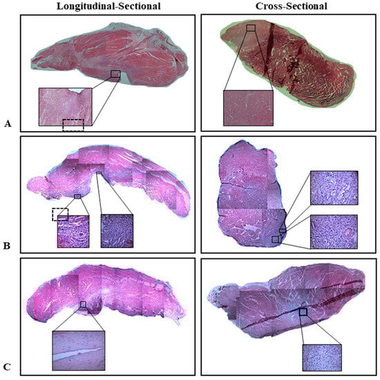 Representative longitudinal and cross-sectional H&E staining images of rat gastrocnemius muscle at 7 days. (A) Injured untreated; (B) saline-treated; (C) MSC-treated. Magnification 200×.