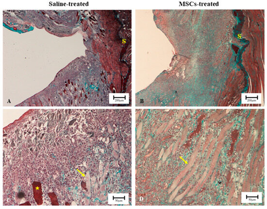 Figure 6 shows the representative longitudinal images of H&E staining of rat gastrocnemius muscles from the four study groups 7 days post-treatment. Masson’s Trichrome staining of the injured muscle showed that, in general, the incision areas in both groups were free from debris (Figure 7). In the saline-treated group (Figure 7C), some degenerating muscle fibres (indicated by yellow asterisks) were still observed, along with dense cell infiltration on both sides of the incision site. In contrast, in the MSC-treated group, both sides of the incision were largely occupied by actively forming myoblasts (shown in yellow arrow) (Figure 7D). Given that the incisions were performed at similar regions and comparable depths, it was notable that the MSC-treated muscles (Figure 7B) exhibited better recovery, as evidenced by a reduced wound depth and increased thickness of muscle tissue to the left of the intramuscular septum (labelled with S) in the MSC-treated muscles. In addition, at higher magnification (Figure 7D), inflammatory and interstitial cell infiltration was mild, and the presence of well-formed myoblasts was apparent in MSC-treated muscle. Further analysis of the Masson’s Trichrome-stained sections (at higher magnification) using ImageJ showed that, among the injured muscle groups, MSC-treated samples exhibited a relatively lower proportion of fibrotic area compared with the saline-treated group (Table 4).