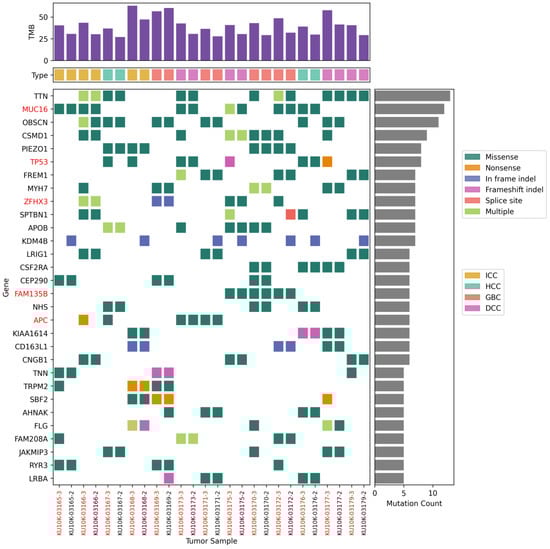 Top 30 most frequently mutated genes. Somatic mutations of single-nucleotide variants and indels in patients with biliary tract cancers.