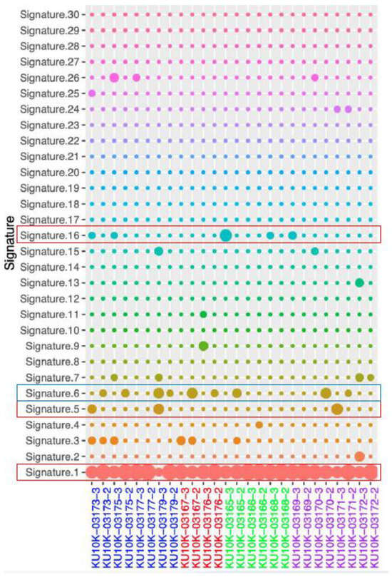 Mutational signatures are shown in Figure 3. Age-related signature 1 was detected in both NAT and tumor tissue samples from all patients. The NAT samples from patients S170, S390, S427, S425, S429, S424, S426, and S037 harbored signature 6, which is related to defective DNA mismatch repair. In contrast, signature 5 was predominantly observed in tumor samples from patients S429, S424, and S037, whereas signature 16 was present in tumor samples from patients S423, S170, S430, S424, and S426. Although these signatures have been found in most cancer samples, their etiologies remain unknown. Ultraviolet exposure-related signature 7 was found in tumor samples from patients S426 and S037, as well as in NAT and tumor samples from patient S431. Mutation signatures 6 and 15, both associated with defective DNA mismatch repair, were found in the tumor samples from patient S037. Additionally, signatures 15 and 26 (related to DNA mismatch repair) were identified in the dCCA sample from patient S426. Moreover, signatures 2 and 13, which are related to the apolipoprotein B mRNA-editing enzyme catalytic polypeptide, were found in tumor samples from patient S431.